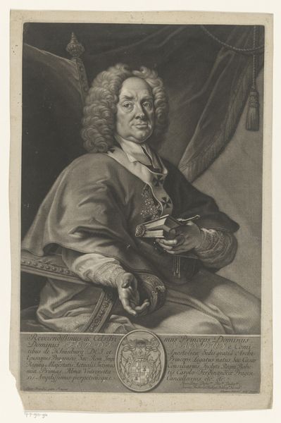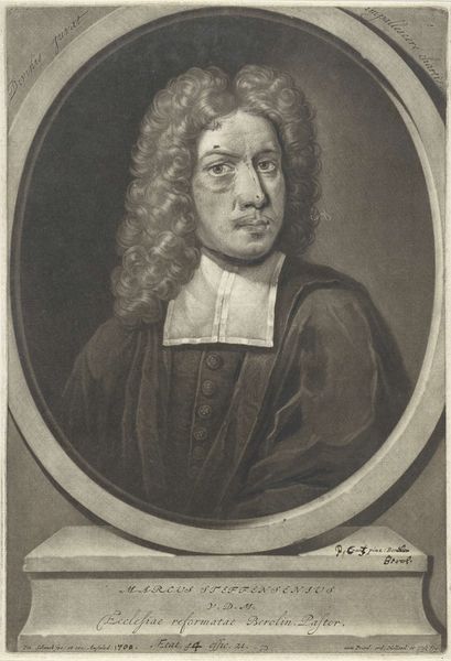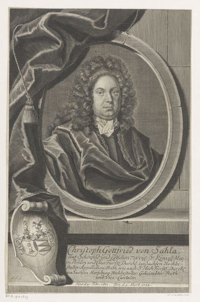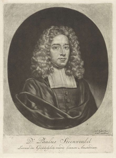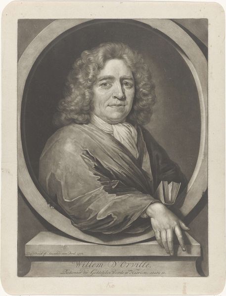 Curator: Here we have Hendrik Pothoven’s "Portret van Friedrich Adolph Lampe," completed around 1748. It's a study in charcoal, pen and paper, and holds a certain…gravity. Editor: Gravity is right! The whole piece has a sepia tone. Our subject looms, his eyes direct, hand raised in what feels like a very considered gesture. There’s a touch of stage presence to him. Curator: The Baroque style really lends itself to that drama. Lampe was a prominent theologian, and Pothoven seems to have captured that sense of authority. The frame around him acts almost like a proscenium, presenting him to us. That gesture, a professor's pointer. It adds another layer. He appears poised, thoughtful, about to lecture, right? Editor: Yes, he definitely embodies a figure of intellectual authority. It’s interesting how the shadows are deployed too—obscuring some areas and highlighting his face and hand. Light and shadow carry weight. It creates a specific emotional feel. Curator: Precisely! The chiaroscuro is deliberate. Consider the gaze as a tool. What is our memory response, what does this portrait make us think about? Editor: He embodies an era of thinking, now faded into a dream. His wig seems like something from a lost dream now, and it makes me ask myself... In what dream does his truth and learning still make sense? Or is it possible at all? Curator: It all comes down to the weight of the signifiers, right? Wigs, robes, gestures all carry embedded context to give this portrait strength. It almost feels theatrical now. But I think the work endures, even without knowing Lampe's specific theological contributions. Pothoven captured an archetypal presence. Editor: An era perfectly distilled in shades of grey... it makes you wonder what the 21st-century version would be, right? Curator: I do hope our version involves charcoal! Thanks for considering this with me.