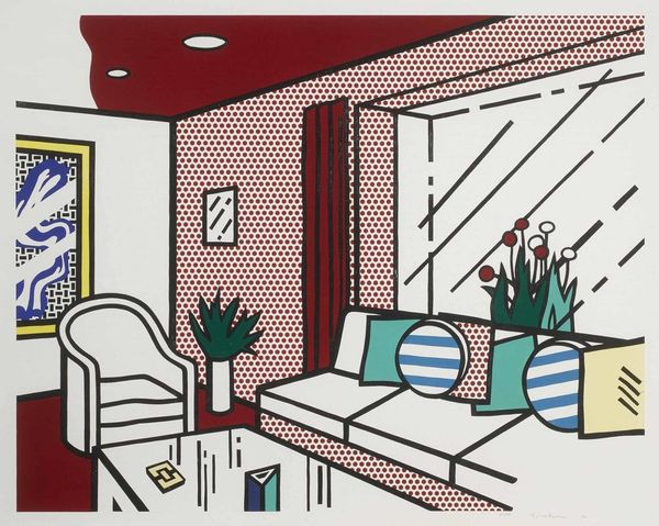 Roy Lichtenstein made this large interior painting, Interior with restful paintings, with oil and magna on canvas, but there's nothing restful about it! Lichtenstein’s work can feel like a comic strip brought to life; it is painting that embraces industrial processes. Notice the heavy black outlines that define each object and the use of Ben-Day dots that create a uniform texture. The scene is a flat, vibrant space, and these dots give the impression of depth while reminding us that we are looking at a reproduction. This tension between representation and abstraction is at the heart of Lichtenstein's work. Take the two framed pictures of landscapes in the back. With their horizontal lines, they poke fun at the very idea of landscape. Are they restful? Lichtenstein seemed interested in how art could be both a highbrow pursuit and a mass-produced commodity. In this way, he shares a common sensibility with artists like Andy Warhol who understood that art can be both smart and accessible.