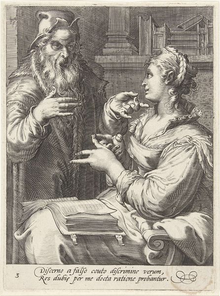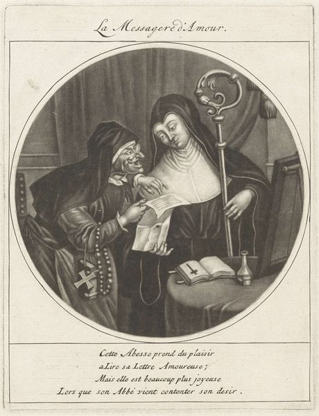 This drawing by Cornelis Dusart, made sometime in the late 17th century, depicts a monk and a woman. The composition is organized within a circle, creating an intimate, almost voyeuristic view into a private scene. Dusart uses a subtle yet effective contrast between light and shadow to sculpt his figures. The texture of the monk’s beard and the woman’s dress are rendered with meticulous detail, inviting the viewer to consider the material reality of the scene. Notice how the artist employs a semiotic system of signs through objects, such as the surgical tools, the rosary, and the wine glass. The drawing destabilizes established meanings. The contrast between religious and earthly elements raises questions about the values, morality, and categories of the time. The circular frame and the calculated use of chiaroscuro invites us to interpret this artwork and to question the meanings it presents.