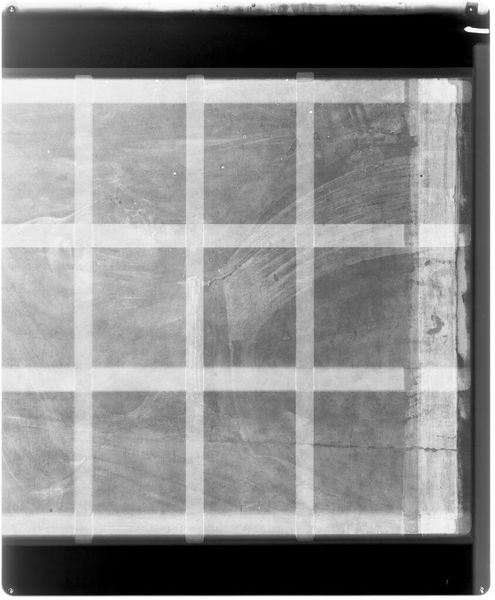 Editor: This is an x-radiograph of "Cradled Panel," likely by Domenico Veneziano. It's eerie, seeing the layers beneath the surface like this. What hidden stories does this reveal to you? Curator: The grid imposed upon the image reminds us of the layers of cultural memory embedded within art. This isn't merely a technical view but a symbolic one. Do you see how the face seems to be peering out from behind a veil? Editor: Yes, I see it now! It's like uncovering something that was deliberately hidden. Curator: Exactly! The x-ray reveals a history of reconstruction and perhaps even intentional obscuring. It’s a palimpsest of cultural and artistic decisions. Editor: It’s incredible to consider the layers of meaning behind what we see. Curator: Indeed. It's a testament to how images can carry so much unspoken weight.