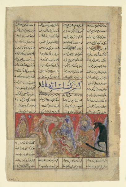 Curator: This watercolor painting, likely created between 1585 and 1635, depicts "Suhrab Slain by Rustam" and originates from a Shahnama, or Book of Kings, by Firdausi. It's currently housed at the Metropolitan Museum of Art. Editor: Oh, my heart! Just looking at this, the sheer *weight* of grief practically radiates off the page. The stillness in the figure on the ground… it’s like a silent scream. Curator: Precisely. This folio captures a pivotal moment from the Persian epic: the tragic climax of the story of Rustam and Suhrab. Blinded by deception, Rustam unwittingly slays his own son in combat. Consider the layered identities at play – father and son, hero and tragic figure – and how those power dynamics intersect within a narrative steeped in themes of fate, honor, and loss. Editor: The horses, though! Their faces are incredible. That stunned bewilderment, almost like they *understand* the horror that’s just unfolded. There’s such a sharp contrast between the ornate detail of the horses and garments, almost excessively luxurious, and the raw simplicity of the sorrow. Curator: Yes, that tension is key. Notice the careful rendering of detail. It exemplifies the sophisticated aesthetic prevalent in Persian miniature painting of that period, yet, these stylistic refinements highlight the emotional complexity embedded within the narrative itself. Think about the context. It's not merely a visual representation. It reflects the social, political, and ethical values circulating within the culture that produced it. Editor: So, do you think an audience unfamiliar with the Shahnama will still connect with this image? Curator: Absolutely. While prior knowledge enhances understanding, the fundamental themes of familial conflict and the consequences of deception resonate universally. Art serves as a space to analyze these complex dimensions of human existence, both historically and in the present. Editor: You’re right. Looking at it now, that primal ache, that devastating knowledge...it hits you whether you know the story or not. This tiny watercolor holds a whole universe of pain. It's unexpectedly affecting.