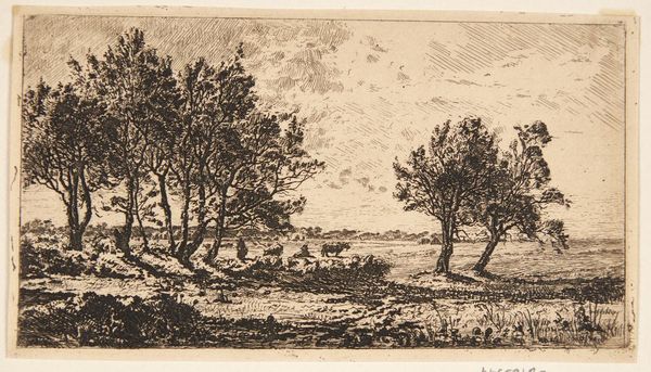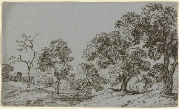 Curator: Welcome. We're here to consider Franz Kobell's "High Grove of Trees," a drawing residing here at the Städel Museum. Editor: It strikes me as quite evocative—a feeling of gentle enclosure. The stark black ink creates a scene brimming with depth despite the simplicity. Curator: Absolutely. Observe how Kobell utilizes the ink medium. His commitment to line work—short, deliberate strokes and layered cross-hatching—yields the impression of varied textures. Do you see the subtle gradations? Editor: The dynamism is remarkable. One notes the almost hurried strokes depicting the sky—horizontal and fleeting compared with the detailed rendering of the tree foliage below. It suggests movement and atmospheric change, doesn't it? Romantic sensibility through and through. Curator: Precisely. His landscapes often align with Romanticism, capturing the sublime through ostensibly simple natural scenes. Consider, though, what isn’t visible: the human figure. Kobell seems to emphasize nature untouched, raw in its presence. Editor: Yet it also implies human impact, doesn’t it? We find ourselves at the edge of this high grove. Viewers, therefore, become actors within its narrative, aware of the act of viewing and the imposition on this unadulterated vista. Curator: Indeed. These landscapes weren’t intended as pristine mirrors. They acted as expressions, projections. A commentary perhaps on man’s simultaneous connection to and distance from the pastoral idyll that was quickly receding even then. Editor: It’s curious how Kobell positions the scene, seemingly a world beyond a ridge, partially concealing it and making us long to traverse it. This makes us long for something beyond. Curator: His calculated technique forces one to contend with the philosophical undercurrents that ran parallel with the Romantics' fascination with nature. We are drawn into, perhaps, an imagined German past as the continent raced towards modernity. Editor: Considering these nuances deepens my admiration for "High Grove of Trees." What appeared as simple realism reveals a far more profound contemplation on Romantic idealism. Curator: Precisely. Kobell, in a subtle but definitive manner, offers insight into a vision for nature as a counterweight to a transforming world.