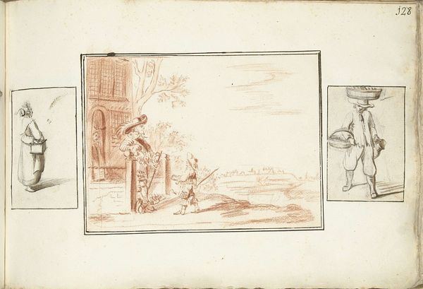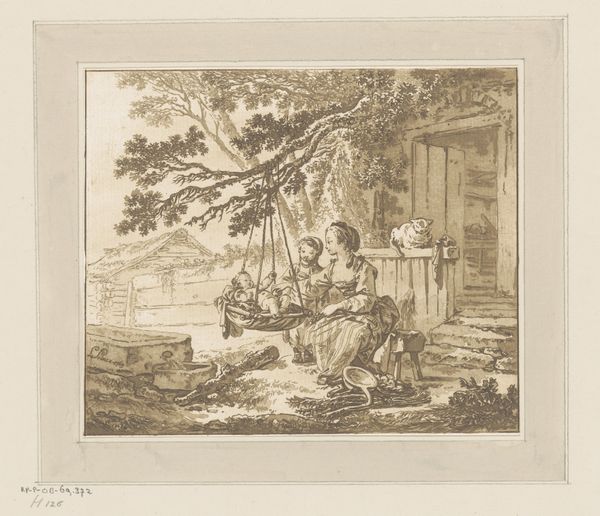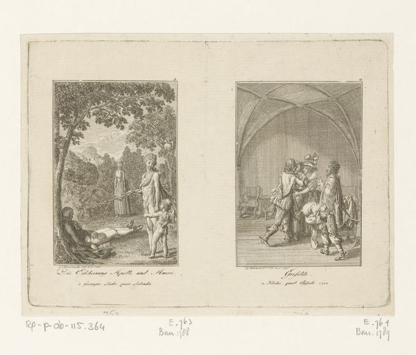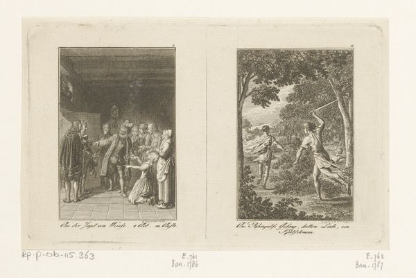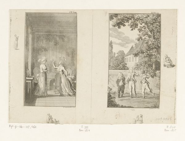 This etching by Daniel Nikolaus Chodowiecki presents a diptych, contrasting an interior scene with an exterior one. In the left panel, the gesture of reaching out speaks volumes. We see a man extending his hand, a primal invitation or plea that echoes through art history. Consider, for instance, the Creation of Adam by Michelangelo, where the almost-touching fingers symbolize the spark of life, of connection. Here, too, this reaching is fraught with tension, loaded with desire and uncertainty. Outside, beneath the shade of a large tree, stands a couple, locked in a silent embrace. The tree, a symbol of life and knowledge, casts a shadow that speaks to hidden truths and subconscious desires. This act of embracing is a timeless motif, appearing in countless forms from ancient fertility idols to Renaissance paintings. It represents a fundamental human need for comfort, for union. The shadow of the tree alludes to the complexities of these relationships, hinting at the unseen forces that shape our connections. The image resonates with the eternal cycles of human experience, continually renewed, reborn, and re-imagined across generations.