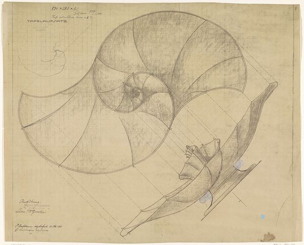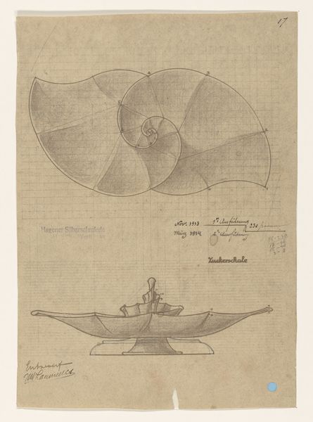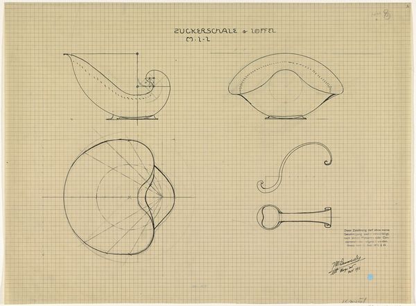 This is Mathieu Lauweriks' "Ontwerp voor zout- en pepervaten," or design for salt and pepper shakers, an undated work rendered on graph paper. Note how the precise grid underpins the organic forms of the containers, a visual tension that immediately captures the eye. Lauweriks, deeply involved with theosophy and geometric systems, uses the grid not merely as a tool, but as a foundational structure mirroring the underlying order he perceived in the universe. The spiral form of the larger container, bisected by geometric lines, is not arbitrary; it reflects principles of growth and proportion found in nature, principles that fascinated artists and thinkers of the era. These shapes suggest a semiotic system where geometric forms act as signs, pointing towards a deeper, more spiritual understanding of design. Consider how Lauweriks’ design challenges conventional notions of ornament, integrating form and function through a structured, almost mathematical approach. The design invites us to consider how even the most utilitarian objects can be imbued with meaning, reflecting the profound connections between art, science, and spirituality.