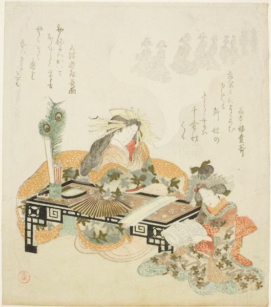 Curator: The muted palette of this print initially suggests a calm interior, perhaps domestic in nature, though I sense something quite formal about the arrangement of figures. Editor: You're right, the atmosphere feels rather tranquil, almost subdued. Now, this woodcut print by Yashima Gakutei, created around 1821, is part of a series titled "Twenty-four Japanese Examples of Filial Piety for the Honchoren". Curator: Ah, that sheds light on the arrangement. It becomes evident that Gakutei invokes traditional values. What stories are embedded in this imagery, shaping its appeal? Editor: The stories come from the larger theme of Confucian filial piety and these stories were deeply ingrained in the social fabric of Edo-period Japan. Gakutei cleverly integrates the values and stories into his depictions. Curator: I find the composition remarkable. The layering of figures and textiles creates a dense yet visually balanced design. There’s also a clear visual hierarchy established here that directs the viewer to particular narratives being represented. What can you tell me about the socio-political aspects related to works like these? Editor: These prints reinforced societal expectations, especially during a time of increasing social mobility. They also promoted the samurai values amongst merchants and craftsmen and upheld social order amidst periods of urban growth. Museums play a key role now by bringing these historical prints to wider audiences. Curator: Absolutely, museums play an essential role in fostering inter-generational dialogue on societal issues reflected in this genre painting, reminding us of continuity and change across cultures and time. It's an echo chamber, where historical narratives get a modern audience and an informed debate ensues. Editor: It’s fascinating to reflect on how prints, like Gakutei’s, served as cultural cornerstones, quietly reinforcing values but stirring discussions even two centuries later, under very different institutional settings and with audiences equipped with various vantage points.