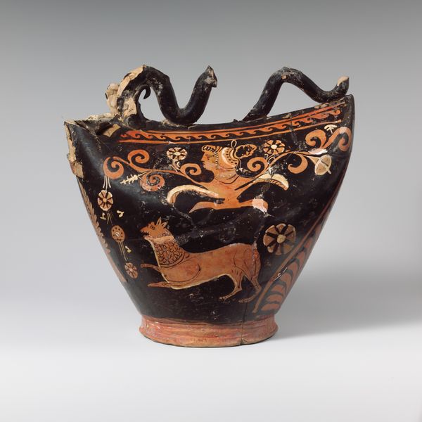 This terracotta kyathos, or cup-shaped ladle, was created by the Group of Berlin 2095. The vessel strikes a chord through its symmetrical structure, divided by bold, circular motifs on either side of a figurative scene. The contrasting black and reddish-brown tones create a visually arresting composition. At the center, a male figure is depicted, carefully framed, in an act that invites contemplation. The symmetry here introduces us to structuralism: the pattern of black and reddish-brown, the balance of shape and form, suggesting an underlying structure and order. Ultimately, this kyathos is more than just a vessel. It's an exploration of form, function, and underlying structures. It invites us to consider not just what is depicted, but how the elements come together. It’s a cultural artifact and philosophical object, leaving itself open to endless interpretation.