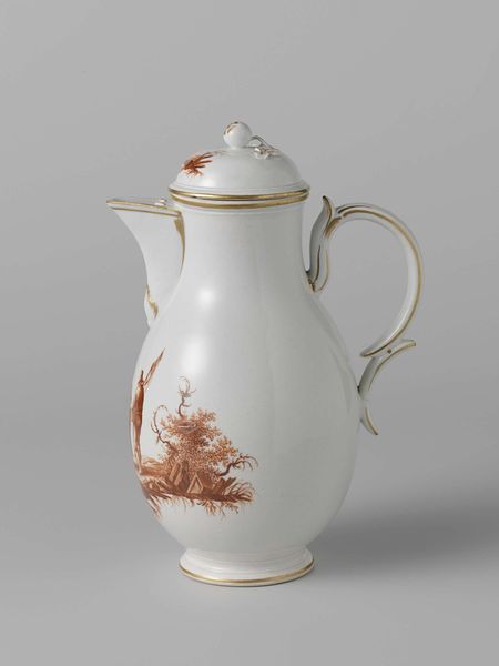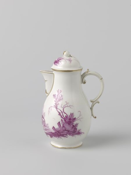 Curator: Take a moment to consider this porcelain coffeepot, produced in Ansbach around 1785. The piece is adorned with delicate figuration and an allegorical scene of putti amongst clouds. Editor: It's striking! The lavender hues against the stark white porcelain are really romantic and… almost melancholic, aren't they? It’s also remarkably small! Curator: Indeed. Rococo, with its playful elegance, served as an aesthetic retreat for the aristocracy in response to social upheaval, masking their anxieties. Miniature works such as this Ansbach coffeepot embodied wealth. Editor: The cherubic figures feel at once innocent, with a more loaded context knowing of its origins. These putti become symbolic, obscuring a complicated historical landscape and real-world impact of these lavish commodities. Curator: Porcelain, by this time, was highly sought after. European factories tried to emulate the craft coming from China, with pieces like this reflecting its place as status symbols in domestic spaces, far removed from the means of acquiring resources for its production. Editor: Absolutely, its diminutive stature serves to further distance the piece and the subject from those who lack such privilege. Do you think that art could disrupt existing social structures? Curator: Rococo became synonymous with the elite; the porcelain reflects social performance during an age of revolutionary change. It's unlikely the aristocracy could reflect on their wealth in that context. Editor: So, its aesthetic appeal worked to deflect more than captivate? Curator: In many ways, yes. To its original owner, this coffeepot perhaps spoke of luxury and comfort within the sphere of domestic life and served as a source of everyday aesthetic joy. Now it speaks to us about cultural history. Editor: Now, viewing its significance gives it meaning!