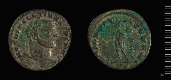 Editor: Here we have a fascinating artifact: an Antoninianus of Diocletian. Seeing it, I'm immediately struck by the weight of history in such a tiny, worn object. What stories do you think this coin whispers to us? Curator: Ah, it murmurs of power, doesn't it? The radiate crown marks Diocletian, a ruler who tried to fix a fracturing empire. Look at the figure on the reverse – likely a deity promising prosperity, a bold pronouncement minted for all to see, but did it hold true? Editor: I wonder if people at the time felt the same sense of distance from the ruler that I feel looking at this today? Curator: Perhaps. Or maybe they felt seen, represented. It's all a matter of perspective, isn't it? Editor: I never thought of it that way. Thanks! Curator: My pleasure. It's always rewarding to look at things from another angle.