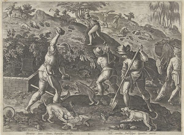 Philips Galle made this engraving, "Deer Hunting with Traps," around 1600 in the Netherlands. The scene depicts a group of hunters and dogs in pursuit of deer in a forest, with some deer caught in nets. This image offers a glimpse into the social and cultural values of the time, reflecting the importance of hunting as a pastime for the aristocracy and the wealthy merchant class. Hunting was not only a source of food, but also a symbol of status, power, and control over the natural world. The detailed rendering of the landscape and the animals also speaks to a growing interest in natural history and scientific observation. The print was made during a time of great social and political upheaval in the Netherlands, as the Dutch were fighting for independence from Spanish rule. The image can be read as a commentary on the social structures of the time, with the hunters representing the established order and the deer symbolizing the forces of change and resistance. To fully understand this artwork, we can consult historical sources, such as hunting manuals, emblem books, and political treatises, to shed light on the complex social and political meanings embedded in this seemingly simple image.
