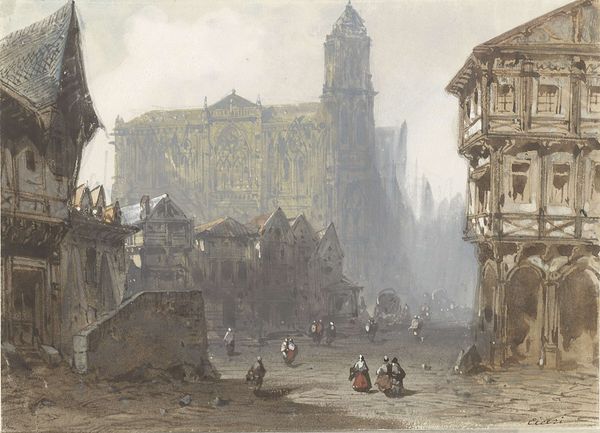Jenaro Pérez Villaamil created this oil on canvas painting titled, *Seville Catedral on the Side of the Steps*. Villaamil painted this scene during the Romantic period in Spain, a time when artists were focused on emotion, individualism, and the grandeur of the past. The Seville Cathedral, a monumental symbol of religious and cultural history, embodies this fascination with the historical. The painting's composition, with its dramatic perspective and emphasis on light and shadow, enhances the emotional impact of the scene. The figures at the base of the cathedral suggest a narrative beyond mere architectural depiction. They depict everyday people interacting in the shadow of this magnificent structure. This is where we see the intersection of the sacred and the secular, the personal and the communal, allowing viewers to reflect on the cathedral’s meaning in their own lives. The artist captures not just the physical grandeur of the cathedral, but also the vibrant, lived experience of the people within its shadow.