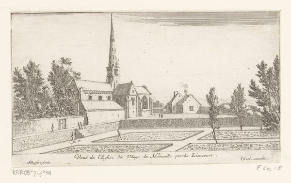 Eberhard Cornelis Rahms created this etching called 'Gezicht op Oudewater'. The composition presents a wide, panoramic view that invites your eye to traverse across the landscape. The horizon line is set relatively high, emphasizing the horizontal expanse of the scene. Rahms uses delicate, intricate lines to define forms and textures. Notice how the lines vary in thickness and density to create a sense of depth and atmosphere. Light and shadow are subtly rendered, enhancing the three-dimensionality of the buildings, foliage, and figures. There is a dialogue between the natural and the built environments. The windmills and grazing cows contrast with the verticality of the church spires and industrial chimneys. This etching captures a moment in time, a specific location, yet it also speaks to broader themes of human presence within the landscape. The artist prompts us to consider how the visual elements convey cultural and historical meanings.