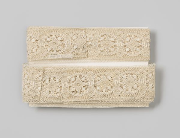 Editor: Here we have "Lint van kant, geschulpt en gepicoteerd, met bloemdecoratie," a piece of lace from around 1920, housed in the Rijksmuseum. I find the intricate floral design quite beautiful, but also very delicate. As an art object in a museum, divorced from its original purpose, what can we say about the cultural role this textile played in society, and how it's viewed today? Curator: That’s a great starting point. This lace ribbon represents more than just a decorative element; it embodies social status, skilled labor, and shifting notions of femininity during the early 20th century. The Industrial Revolution had begun to make lace production more accessible, but handmade lace, like this, retained its exclusive appeal. Who was wearing it and how did they use it? How did these displays impact how different classes interacted and saw themselves? Editor: So, its value stemmed from being both aesthetically pleasing and representative of a certain level of social standing? Was it also seen as a reflection of the wearer's character? Curator: Absolutely. Consider the symbolism embedded within the floral motifs. Flowers often carried specific meanings within Victorian and Edwardian society, conveying messages of love, fidelity, or remembrance. Therefore, choosing this specific lace signified intentional communication and social awareness. The very act of adorning oneself with such a piece can be considered an expression of identity, crafted within specific cultural and economic frameworks. The visibility of such artistry was critical to creating social distinctions. Editor: That is insightful, viewing it not just as material, but as an act of social dialogue. It’s easy to overlook the power of something that now appears so quaint. Curator: Indeed, its current display within a museum setting also influences its meaning. The lace is transformed from a functional adornment into a preserved artifact. The museum bestows upon it a different type of value—historical and artistic rather than purely social or economic. Editor: So, our understanding of art isn’t just about what it is, but about how society interacts with and ascribes meaning to the art. Thank you. Curator: Exactly! Thinking about these broader influences allows a deeper understanding of art history, one that isn’t simply about aesthetics, but one centered around humanity.