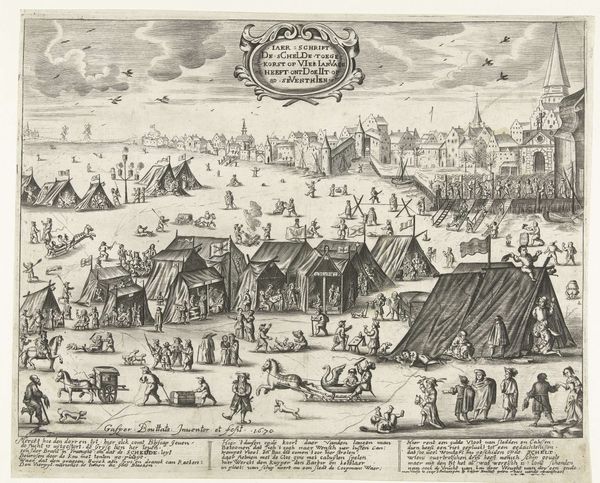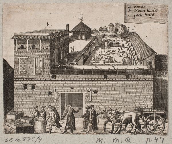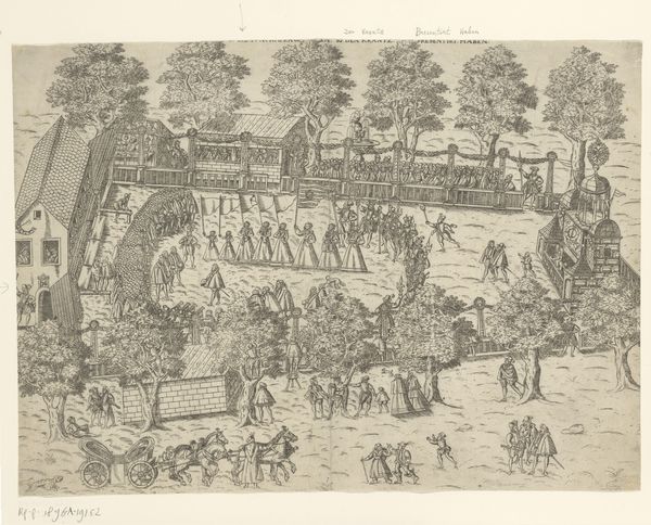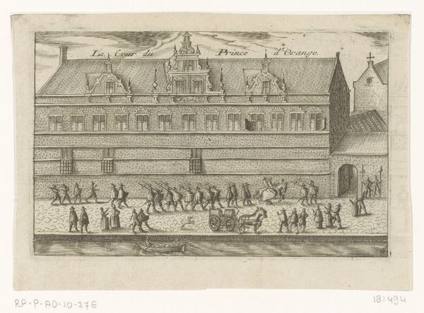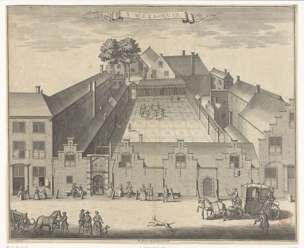 Editor: Here we have "Gezicht op het Hofje van Dam te Den Haag," dating from around 1730 to 1736. It's an engraving, depicting a Dutch Golden Age cityscape. I’m immediately struck by the rather unique, almost fantastical perspective. What elements of composition draw your eye? Curator: Indeed. Notice how the composition hinges upon a rigorously applied, yet ultimately destabilizing, perspective. The lines converge towards a vanishing point, of course, yet the flattening effect suggests less an illusion of depth, and more an exercise in graphic construction. How do the linear elements function here? Editor: They create a sense of order, especially within the structured garden and the lines of houses, but there's also a contrast with the more organic forms, like the trees, and the people scattered in the foreground. Curator: Precisely. The linework establishes not only form but also hierarchy. Note the precise delineation of the architectural elements, against the looser rendering of the figures. This speaks to a prioritization of structure, a Cartesian order imposed upon the apparent chaos of daily life. Do you find the line quality consistent? Editor: Now that you mention it, some lines are bolder than others, particularly in the foreground. Does this signify emphasis? Curator: Consider the semantics of line itself. Thicker lines create visual weight, drawing our attention to specific areas. The artist manipulates these qualities to guide our gaze and, in essence, to construct a particular reading of space and social relations within it. The controlled hand exposes the means by which pictorial space, and therefore meaning, is manufactured. How might semiotics illuminate further the symbolic structures at play here? Editor: I hadn't thought about it in such detail. Seeing how the line weight, the structure, and the perspective all play together really deepens my understanding. Curator: Precisely, considering these elements of construction allows us to appreciate the depth to be found even in what might seem a straightforward cityscape.