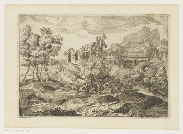 Jens Knudsen created this print, ‘En landevej i en bjergegn’ around the late 17th to early 18th century. The composition is dominated by a central procession of figures within a mountain landscape, rendered with precise, etched lines that define the scene's forms and textures. Knudsen employs a strategic arrangement of light and shadow to delineate shapes. Notice the fine hatching in the sky, which contrasts with the darker, more densely worked areas of the landscape, creating a sense of depth and volume. The figures, though small, are meticulously detailed, each etched line contributing to their distinct presence within the scene. The print can be interpreted through a semiotic lens, where the road acts as a signifier of movement and transition, while the landscape symbolizes a journey through life. The birds in flight might represent freedom, or a departure from earthly concerns. Knudsen's work invites contemplation on how simple lines can create complex narratives, reflecting enduring cultural and philosophical themes of journey and transformation.