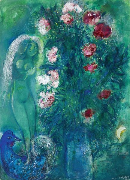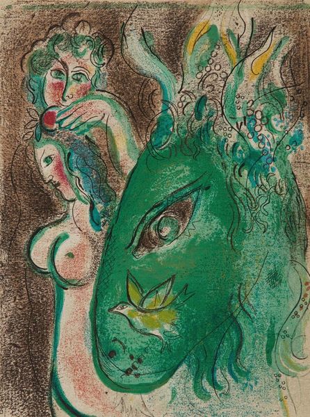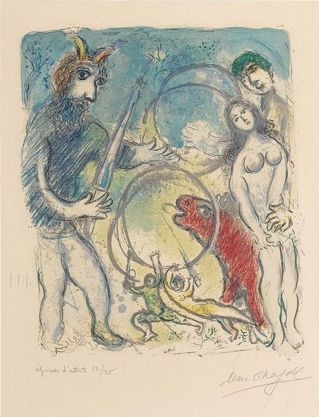 Curator: Oh, what a whimsical scene! Looking at Marc Chagall’s 1967 lithograph "The Circus," I'm instantly transported... there’s a delightful dreaminess to it. Editor: The pervasive blue is striking, certainly setting an almost melancholic tone, even within the theatrical context. It really unifies the various figural elements. Curator: Right? It’s almost as if the entire scene is unfolding in a blue dreamscape. See how the figures—the rider, the clown, even the audience—seem to float and overlap? Chagall’s use of line gives such dynamism! Editor: Precisely. The line work does create movement, yet observe how those lines are inherently unstable. There is a distinct flattening of the pictorial space which emphasizes the print's surface and undermines traditional perspective. Curator: Which lends this a fairytale feel, no? Everything feels buoyant and lighthearted! And those pastel pops—hints of rose, the pale green highlight on the horse rider’s limbs! It is very sensual, don’t you agree? Chagall really elevates this from a figurative print. Editor: Undeniably. I interpret that elevation perhaps more stringently: Chagall synthesizes memories and personal mythology through an approach reminiscent of Surrealism. The subjects may reference his reality but their composition suggests subconscious impulses and desires. Curator: Totally. I read in a collection of essays that the circus was this major inspiration for Chagall - the traveling, the performances. He called clowns, equestrians, and acrobats kindred spirits. One time he wrote of their ‘deliberately distorted faces.’ Knowing his Russian roots and the historical moment, that really resonates! Editor: Yes, viewing “The Circus” with its abstracted figures against a backdrop rendered through varying densities of hatching, one certainly senses these broader art-historical contexts and the weight of his past. Curator: Absolutely! And look closely, and I’ll swear you’ll be smelling the sawdust, popcorn, and anticipation… it feels like the show’s just about to begin! Editor: Ultimately, this lithograph is less about literal depiction and more about the construction of feeling. And those blue tones evoke the nostalgic nature of fleeting memory. Curator: It reminds you what joy there is just underneath life’s daily drudgery. How easily joy can float us into dreams if only we surrender… and with Chagall, how easily surrender!