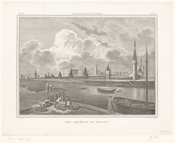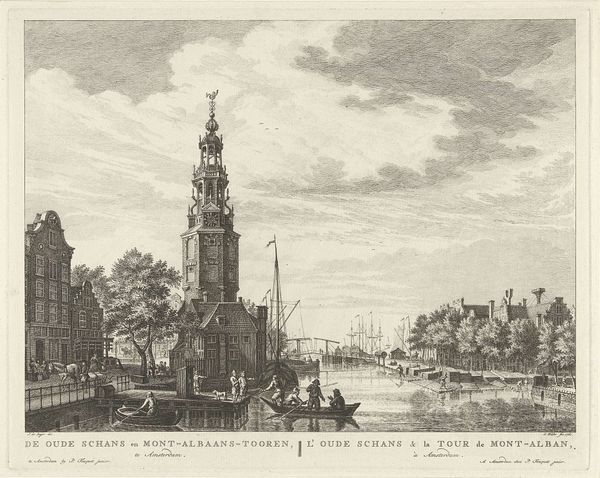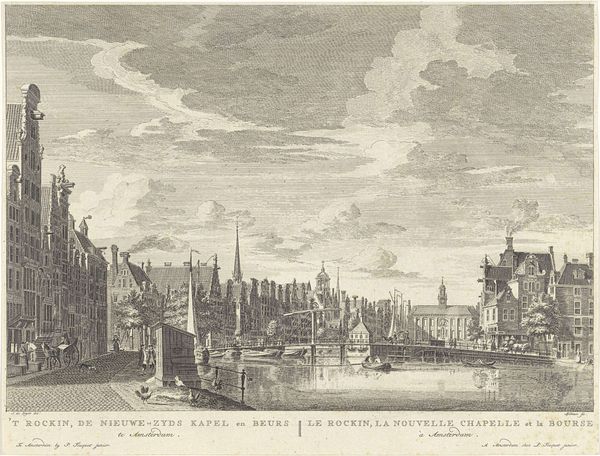 Curator: This engraving by Caspar Jacobsz. Philips, created in 1753, offers us a "View of the Thames and the garden of Somerset House in London," currently residing here at the Rijksmuseum. Editor: What strikes me immediately is the sharp contrast, almost theatrical. It’s very composed; you have the light and dark, a city bustling, and people milling around. A vibrant representation of 18th century London. Curator: Absolutely. Philips was meticulously documenting a very specific moment in London's development, portraying Somerset House, once a royal residence, from a unique perspective, allowing for a glimpse of London from the gardens down to the bustling Thames. Editor: Yes, and consider the politics embedded in that point of view. Access and representation, particularly of private or royal property turned to more public use. The image becomes part of a visual rhetoric of ownership, power, and access in the changing social structure of the time. Who has permission to stand where and create this view for circulation? Curator: Good point! And what Philips captured, technically through incredibly fine lines, allows us to see not only the architecture but also the industrial activity on the Thames – the boats, suggesting trade and London's role as a powerful center of commerce. His deliberate choice of panoramic view emphasizes a broad scope of influence and power, of this landscape and kingdom. Editor: Which also implicitly acknowledges the lives tied to that power. Look closely: do those people working on the Thames share the same privileges or representation in larger society as those enjoying the garden of Somerset House? Consider whose stories are prioritized, and who gets erased, even in a "neutral" cityscape view. It subtly raises essential questions about social disparities. Curator: I appreciate your view. What do you make of its historical significance? For someone who wasn't around at that period to see London, what story does it tell you now? Editor: Beyond offering a physical layout, the print reveals to us a carefully constructed vision of 18th-century London, hinting at themes of industrial growth, royal authority, class disparities and expanding urban environments. Curator: For me, stepping back, what I see is a snapshot of the aspirations and social order of the 1750's, beautifully rendered through the eyes, and skilled hands, of Philips. Editor: And for me, art's job is not just to hold up a mirror but to compel us to ask, Whose reflection is this and who made the glass?