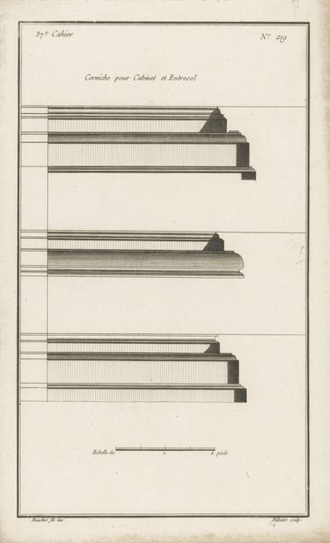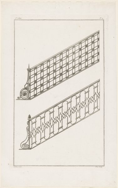 Augustin Foin created this drawing titled "Traphek met bladmotieven" using pen and gray ink, showcasing a design for a stair railing. The composition is dominated by geometric patterns interspersed with organic motifs. Notice how the design marries the rigidity of classical forms with the fluidity of natural elements. The lower section of the railing features repeating squares, each adorned with stylized leaf patterns. Above, the design transitions into elongated loops, suggesting movement and continuity. The artist's careful attention to detail is evident in the symmetrical arrangement of the leaves and the precise rendering of the geometric shapes. Foin's design reflects the period's interest in harmonizing nature and artifice. The drawing can be understood as a negotiation between the rational order of architecture and the unpredictable beauty of the natural world. The formal qualities of balance and symmetry are not merely aesthetic choices but embody a broader cultural desire to impose order on the environment.