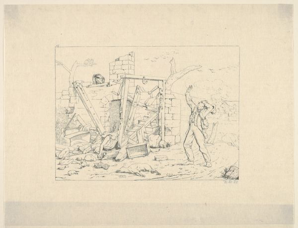 This small print captures a dramatic scene on the deck of a ship, its maker unknown. It was created using a process of engraving, where an image is incised into a metal plate, which is then inked and printed. Look closely, and you can see how the density of the engraved lines creates different shades of grey, conveying the chaos of the storm. The fine, precise lines speak to the engraver’s skill. Notice how the diagonal lines evoke the relentless rain and the turbulent sea, while the closely packed lines give the impression of dark shadows. Prints like this were often made for mass distribution, a relatively inexpensive way to circulate images and narratives. The scene speaks volumes about labor, risk, and survival in an era when maritime trade was vital. The image reminds us that even seemingly delicate artworks are deeply connected to the world of work and the realities of life at sea.