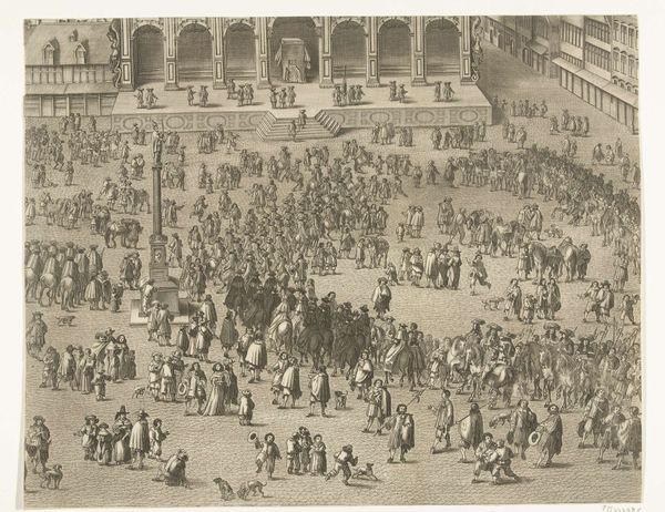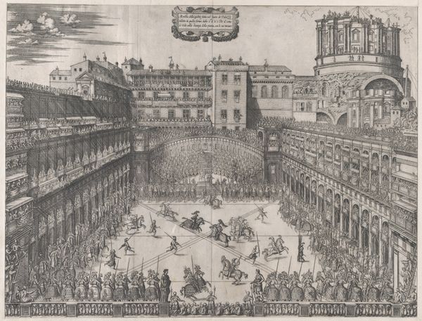 Editor: This intricate print by Jacques Callot, titled "Parade: the Entrance of the Chariots of Africa and Asia," really captures a spectacle. I'm struck by the sheer amount of labor that must have gone into both the event and its depiction. What do you see in this piece, considering the material conditions of its creation? Curator: I see the etching primarily as a record of production, but also consumption. The very act of Callot meticulously engraving this scene, the press churning out copies, speaks to the material reality of courtly entertainment. How does this spectacle reinforce the Grand Duke's power through displays of wealth and imported goods? Editor: So, you're saying it's not just about the artistic skill, but about the process and the resources involved? That's fascinating. Curator: Precisely. Consider also the paper itself, its sourcing and distribution. Callot’s print makes visible the elaborate material networks underpinning the Duke’s power. Editor: I never considered the paper itself as part of the message. Thank you.