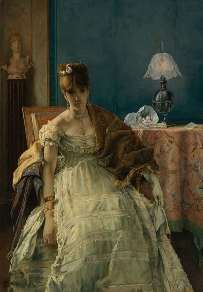Editor: Here we have “Curious,” an oil painting by Alfred Stevens. I find it immediately intriguing - she's clearly eavesdropping! What catches your eye when you look at this piece? Curator: Ah, yes! I can almost hear the hushed whispers she's trying to catch! You know, I see in this painting a glimpse into a very private world, or rather, the desire to enter it. The screen becomes a porous membrane between worlds. Consider the colors, warm golds clashing playfully with the stark white of her dress. What do those contrasts tell you? Editor: It feels… secretive, but also playful, like she’s not entirely serious. Is she a gossip, or is there a higher intrigue? Curator: Maybe both! Think of the era, that sense of longing, but also those restrictions that society placed on women. How many avenues *did* they have for engaging with the world? For me, I wonder: Is she acting out of boredom, desperation, or true, strategic intrigue? Perhaps she wants something more than just pretty peonies and silks? Editor: So, maybe this isn't just about eavesdropping; it's about a woman trying to find her place, and meaning, in a gilded cage. It hits a lot harder viewed that way! Curator: Exactly! It invites us to become a bit of an eavesdropper ourselves! Always try and consider: Who is outside of the frame, and how does their existence reflect back into this private little universe that Steven has captured? It is all about an unseen world colliding with the very carefully constructed world in view! Editor: Wow, I’ll definitely be looking at paintings with new ears from now on! Thank you for showing me the subtle language of curiosity. Curator: The pleasure's all mine, onward we go into a deeper understanding of these paintings!