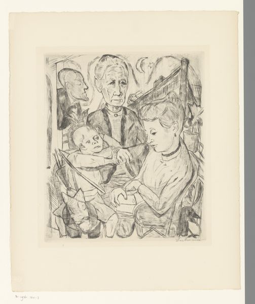 Editor: Here we have Mitchell Siporin’s "In the Studio," a print from the Harvard Art Museums collection. The angular forms create a slightly unsettling mood for me. What visual relationships stand out to you? Curator: Note how Siporin manipulates line and form to create a dynamic tension. The figures, rendered with fractured planes, almost seem to merge with the geometric background. Consider the interplay between positive and negative space. How does this impact your perception? Editor: It's like the figures are constructed from the same visual language as their surroundings. I see that now! Curator: Precisely. The artist emphasizes the two-dimensional surface, flattening the image and drawing attention to the constructed nature of representation itself. It is the structure that defines the image. Editor: I appreciate how you refocused my attention on the formal elements. It has given me a new perspective of this piece.