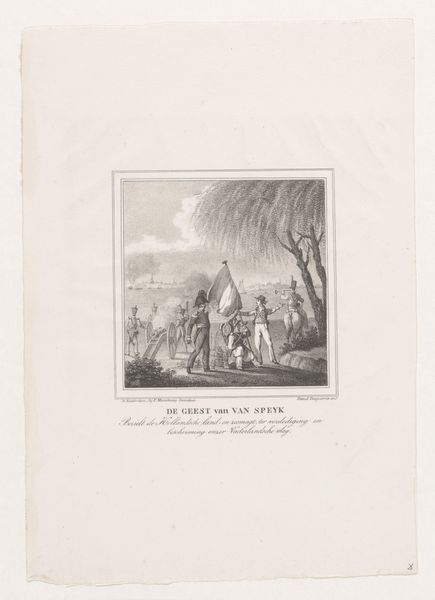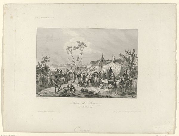 Editor: So, here we have "Soldiers and Travellers Before a Tent," by Amédée Paul Greux. It's an etching made sometime between 1846 and 1919. It reminds me a bit of a hazy dream. The figures and details seem soft and almost ethereal. What catches your eye? Curator: The immediate impression is one of dynamic stillness, achieved through contrasting tonal values. Note how the artist juxtaposes the light, open space of the sky with the densely packed forms of figures and animals clustered near the tent. Consider the line work: short, repetitive strokes create texture and volume, yet lack sharp definition. This serves to flatten the pictorial space, emphasizing the two-dimensionality of the print. Editor: Flattening… that's interesting. So it's less about creating an illusion of depth, and more about… what? Curator: More about the formal interplay between line, tone, and composition. The repetitive marks, are they simply representational, or do they establish an all-over pattern that transcends the depicted subject matter? Note also the dominance of horizontal lines—the horizon, the ground, the implied lines of the figures at rest. How do these contribute to the overall sense of quiescence despite the implied activity? Editor: I see it now. It’s not really telling a story; it’s about how the lines and light work together to create a mood. I initially overlooked the impact of those horizontal lines. Thanks, I am looking at it so differently. Curator: Indeed. Formal analysis encourages a slowing down, a focused engagement with the language of the image itself, a syntax of marks.