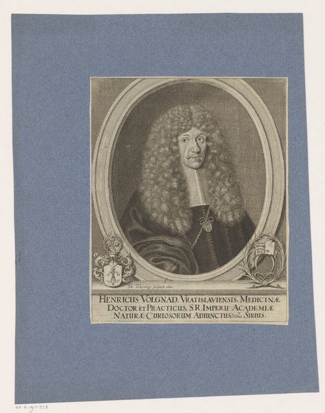 Curator: Immediately I’m struck by the direct gaze and restrained mood of the figure. There’s a sense of contained power here, don’t you think? Editor: Indeed. What you are observing is a 17th-century portrait of Claude Ballin I, rendered through an engraving. Dating back to sometime between 1696 and 1700, this piece, which now resides here at the Rijksmuseum, is attributed to Jacques Lubin. Notice how it employs a meticulous line technique to capture the likeness. Curator: The lines create such striking tonal variations! And what can you tell us about Ballin himself, and why he was considered important enough to have his portrait memorialized? Editor: Well, in life, Claude Ballin was a celebrated goldsmith and he also held a court position for Louis XIV, who was himself, of course, an active patron of the arts. It comes as no surprise then to see him framed within such formal composition, complete with coat-of-arms. The oval surround further reinforces this visual declaration of stature and importance. Curator: You know, what resonates with me most is the symbolic tension in this period—it’s as if these formal displays of nobility were inherently laced with anxiety, with uncertainty about the future... There is this wonderful theatricality to it all, an anxious need to perform significance and command through dress and posture. Editor: A performance which engraver Jacques Lubin expertly translated through very careful lines. Paper as political instrument! How does the portrait function in light of later social upheaval, for instance, or changing aesthetic tastes? That’s always on my mind. Curator: For me, the face speaks to a shared cultural memory, especially around how we think of Baroque portraiture as an enduring style... It reflects how the visual arts shaped perception across generations, leaving an undeniable mark on our psyche. Editor: Absolutely. I’ll think about the engraving as a window into the complex relationship between artistry, power, and identity within its own historical context.