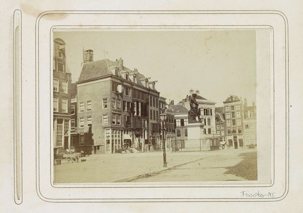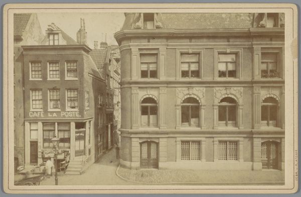 Curator: This gelatin silver print, “Gezicht op het waaggebouw in Enkhuizen,” was captured sometime between 1878 and 1888 by De Vries & Huijsen Jr. It offers a street-level perspective of a historic weighing house in the Netherlands. Editor: Woah, there’s something hauntingly beautiful about this faded image, like a forgotten dream clinging to the edges of reality. It feels like the light itself is whispering secrets of the past. Curator: I think you've touched on something essential here. These types of images are never purely objective. They reflect a particular vision, and it's crucial to examine the power dynamics embedded within such portrayals of urban space during that era. Consider the implied class structure here - who is present, who is absent? And how does that inform the photographer's choices? Editor: Well, sure. It is really saying something, like, who is behind those closed doors? But on a basic level, it's like stumbling upon a building out of time. The old stone, that slight lean in the architecture like an old person's posture... There's a real sense of being transported. Does that building still exist? I wonder if it could tell its own story, like a weathered face that's seen a lot of things. Curator: Many of these Dutch weighing houses were crucial sites for trade and social life during that time. What the artist is doing is playing with representation to cement and also mythologize civic pride. Enkhuizen was a prosperous port at this time, a fact we can easily ignore without proper backgrounding. Editor: Interesting! So behind those stone walls there may be layers of wealth, cultural significance, maybe even shadows of colonial activity, if we were to dig deeper. Art isn’t neutral at all; even historical pieces speak to now. That adds weight to the picture... gives it some much-needed depth. Curator: Precisely! These visual artifacts are points of entry to deeper socio-historical examination. The muted tones invite contemplation on themes like legacy and urbanization—the artist prompts us to examine both presence and absence, encouraging an exploration of overlooked details in this gelatin-silver print. Editor: Thanks to your art history spectacles I see things on new level now... suddenly this sepia world is alive and very politically loud indeed. It makes me ponder all those hidden worlds inside buildings, captured images, personal artifacts. So much gets communicated beyond what we expect, even unintentionally!