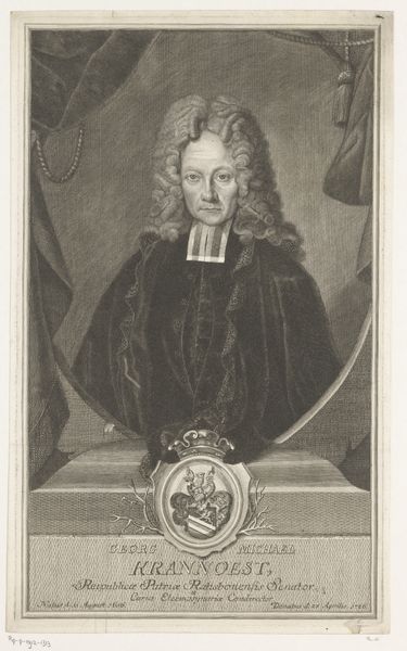 Editor: So, this is a print entitled "Portret van Leonhard Friedrich Voit von Berg," made sometime between 1732 and 1760. It's very stately and formal, but the way the subject's hand is positioned makes him look a little bit like he is about to start conducting an orchestra. What do you see in this portrait? Curator: Well, beyond the Baroque aesthetic – the heavy drapery, the elaborate wig – I see a powerful statement about identity and social positioning. Look closely at the composition; notice how the subject’s gaze meets ours directly, projecting authority. But also consider the social context: who was represented in art, and who was excluded? How does the history of portraiture intersect with societal power structures? The ostentatious display of wealth in his attire tells us something about class, power, and visibility in 18th-century society, doesn't it? Editor: It definitely screams power. The fact that he has his own crest featured there, in addition to the grand wig and clothes, tells you everything. But if those things are signifiers of wealth, what statement is being made? Is he trying to look like an intellectual with that book? Curator: Exactly. These status symbols construct and reinforce his social identity within a system of privilege. Ask yourself, what narratives are prioritized and perpetuated through art, and whose stories remain untold? The tools of wealth he has surrounding him are intentional, especially since they're printed for distribution and displayed for the public. Editor: So it’s not just about individual representation but about reinforcing an entire social order. This wasn't immediately visible, so it helps to place it in context. Curator: Precisely, we’ve excavated some interesting narratives embedded in the image. What appears straightforward on the surface reveals layers of meaning upon closer inspection.