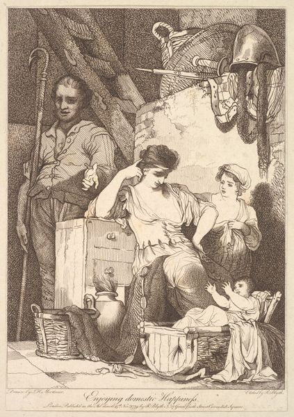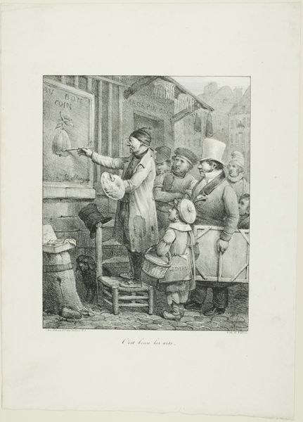 This engraving, "A Traveling Merchant's Stall in the Old Days," offers a glimpse into a bygone era of Danish commerce, though its precise date and creator remain unknown. The image presents a bustling street scene, dominated by a temporary stall overflowing with goods. We see clothing, hats, and household items on display. A family carefully examine a cloth, possibly bartering for a fair price. This artwork evokes a time when commerce was more localized and personal. In many ways it documents the social function of trade and the relationship between vendors and customers. This print likely aimed to elicit nostalgia for a past when communities were more intimately connected through the exchange of goods. To truly understand this work, we need to delve into the social history of Danish trade and commerce. We must consider the role of the merchant class and the changing patterns of consumption. By exploring these historical contexts, we can gain a deeper appreciation for the social commentary embedded within this seemingly simple scene.