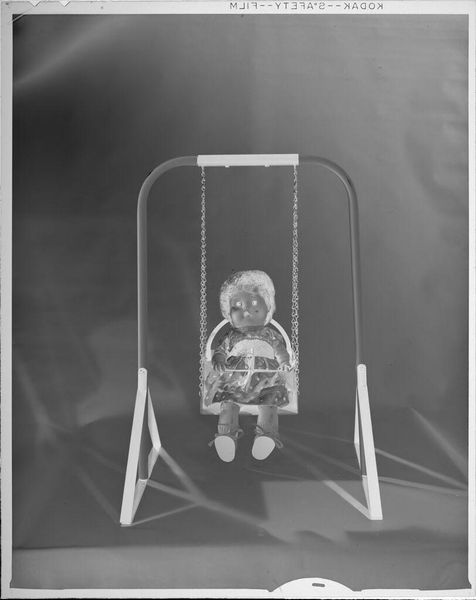Curator: This small black and white photograph from the Harvard Art Museums is called "Untitled (boy riding fake animal)" and is credited to Lucian and Mary Brown. There's a sweetness to it, almost a melancholy, wouldn't you agree? Editor: I see that too, a ghostly, distant memory, like a half-remembered dream. The boy astride the stylized bear becomes an emblem, almost, of innocence and lost play. Curator: Yes! The bear motif is so interesting. Bears, across cultures, represent so many things, from power and ferocity to nurture and protection. Here, it's a toy, domesticated, but the underlying symbolism lingers. Editor: Absolutely. And the child's gaze upward suggests longing, maybe for adventure, maybe for something just out of reach. The image becomes this poignant meditation on childhood's fleeting nature. Curator: It's a simple image but resonates on so many levels. Perhaps that's its power, to draw us into our own remembered experiences of childhood and the things we thought were real. Editor: Well, I know I'm now seeing my own childhood a little bit differently.