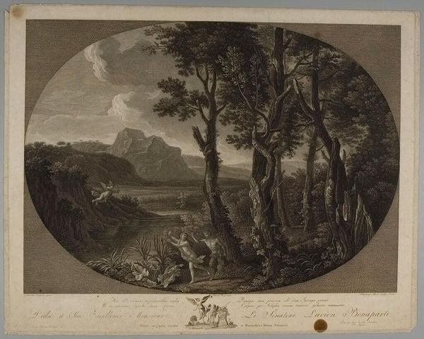 Curator: This is Francesco Morelli's print, Venus and Adonis, part of the collection at the Harvard Art Museums. Editor: It's quite bleak, actually. The tonal range feels limited, and the figures seem overwhelmed by the landscape. Curator: The composition does place the figures within a larger, somewhat ominous, natural world. The story, of course, is tragic, with Adonis dying during a hunt. Editor: Right, the narrative frames male vulnerability. Adonis, the beautiful youth, succumbs to violence, while Venus is left mourning. The idyllic setting becomes a space of death and masculine failure, highlighting the precariousness of patriarchal ideals. Curator: I see it more as a study in contrasts—light and shadow, the ideal and the real. The formal elements create a tension that mirrors the story's emotional core. Editor: Perhaps, but the image also speaks to the ways in which power dynamics can play out in gendered spaces, even in mythological settings. It's about mortality and the societal expectations imposed on men. Curator: A somber reminder, indeed. Editor: A poignant interpretation of the myth, framed by a world that seems as indifferent as it is beautiful.