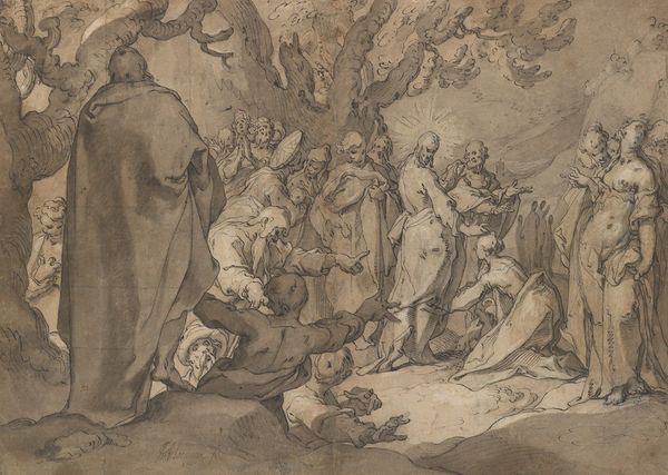 Editor: Here we have "The Mystic Marriage of St Catherine," believed to be painted between 1650 and 1720 by Sebastien Bourdon. It’s an oil painting currently residing at the Rijksmuseum. I’m immediately struck by the landscape backdrop – it feels quite separate from the figures in the foreground. What elements of the painting’s composition stand out to you? Curator: The interplay between the landscape and figuration presents a rather fascinating discordance. Consider the colour palette: the earth tones of the background – browns and ochres – are notably divergent from the pale luminosity which bathes the figures. What does this opposition convey to you? Editor: I think the light and colour contrast makes the figures stand out, almost as though they're superimposed onto a pre-existing landscape. It’s a bit disjointed. Is that purposeful? Curator: Perhaps. Observe also the geometric arrangement of the figures – a series of triangular forms intersected by curvilinear elements. Bourdon employs formal arrangements which serve to emphasize and reify certain elements of the composition and to minimize others. Are there compositional forms here that stand out to you? Editor: The strong diagonal created by the figures certainly creates movement, leading my eye across the canvas. Also, I'm intrigued by the contrast between the detailed rendering of the figures versus the looser brushwork in the landscape. Curator: Indeed. Such discrepancies draw our attention to the deliberate artifice employed in its construction. Through a close reading of these structural devices, we can gain access into how meaning is crafted within the parameters of visual art. Editor: So, by analyzing the form, color, and composition, we begin to unlock the artist's intent, regardless of historical context? Curator: Precisely. The formal elements offer us an inherent language. Editor: This has offered a fresh perspective on interpreting Baroque painting.