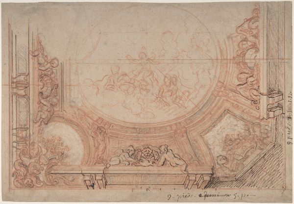 Matías Arteaga y Alfaro created this "Ceiling Design" drawing using pen and brown ink, with brown wash, over graphite. The drawing immediately evokes an emotional response due to the interplay between the rigid architectural forms and the soft, organic shapes of the figures, all rendered in warm tones. The composition is structured around a series of interlocking geometric shapes, each delineated with meticulous precision. Yet, within these strict confines, Arteaga introduces a counterpoint through the inclusion of figures and decorative elements, disrupting the rigidity and introducing a sense of dynamism. Notice how the artist uses a semiotic system of visual components, such as shells and cherubs, to denote themes of purity, love, and divinity. Through this tension between order and dynamism, Arteaga invites us to consider how architectural designs not only define space but also engage with broader artistic and philosophical concerns. The drawing serves as a reminder that art is a site of ongoing interpretation.