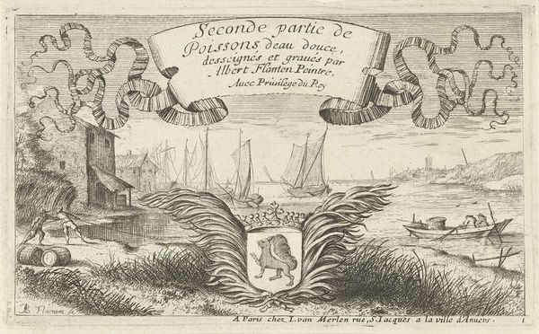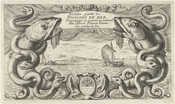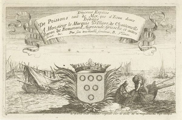 Curator: Let’s consider Albert Flamen's "Zeegezicht door ornamentaal wapen," an engraving likely produced between 1687 and 1749. We see the image’s title within an ornate, decorative frame against a detailed seascape. Editor: Yes, it’s an engraving, a print – it's interesting how this image uses a kind of ‘window’ of ornament to frame a scene of labour at sea. It feels almost… propagandistic, or at least celebratory, of the sea's bounty and perhaps of those who harvest it. What do you see in this piece? Curator: Exactly! Look closer at the inscription— "A Messire Guillaume Tronson…Conseiller du Roy…" The print isn't merely decorative. It's about power, patronage, and production. Engraving itself is a laborious, reproductive technology, and this print showcases that labour in service to royal authority. We need to think about the process. Editor: I hadn’t really considered that the dedication itself becomes part of the material meaning, but it does change how I see the seascape element. Curator: Right! It's the intersection of manual skill and socio-economic structures that interests me. Who were the engravers, the printers, the patrons involved? The quality of line, the type of ink, paper: these speak to the standards, consumption habits, and the overall materiality of art in the period. Where does "high art" stop, and where does "craft" begin when we analyze prints like these? Editor: So, instead of just looking at the scene depicted, we're really looking at how the image itself came into being and its role within a larger network of people and materials? I will definitely look at other artworks this way. Curator: Precisely. It reframes our understanding of artistic value, wouldn't you agree? It becomes about the how and the why, not just the what.
