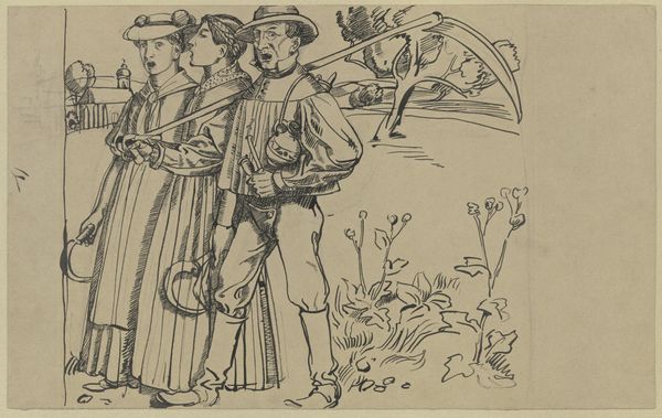 Editor: This drawing, "Twee op elkaar staande zwervers groeten een militaire officier," from 1902 by Carl Rögind, is made with pen. It's striking how the artist uses simple lines to create such a satirical mood. What do you see in this piece that I might be missing? Curator: It's interesting you pick up on the satirical mood so quickly. Looking at this piece, I see a commentary on social hierarchy and perhaps even a critique of the military itself. Consider the power dynamics: two seemingly impoverished men, literally stacked beneath each other to appear taller, salute a military officer. How do you interpret the landscape? Editor: Well, with the church in the background, and given that it's 1902, I initially read the setting as an almost idyllic European scene, before taking into account that the idyllic surface is challenged by the interaction among the characters... but the two vagrants look caricatured to an extent. Curator: Exactly! The artist uses caricature to expose the absurdities of the social order. The church backdrop, while seemingly idyllic, is in direct contrast to the reality faced by the men. And, it may speak to complicity within these established social norms. Have you considered how class intersects with national identity in this work? Editor: I hadn't fully considered it, but now that you mention it, the soldier represents the state, doesn't he? And the two men seem to be doing whatever it takes to…participate, even in a way that demeans them? Curator: Precisely. They’re enacting a performance of patriotism, even if it means sacrificing their dignity, or literally, their stability. The drawing becomes a powerful statement about who belongs, and at what cost. What does the notion of "service" become if coerced, in your eyes? Editor: That's fascinating, I never thought of it that way before. Now, the drawing reads very differently. Curator: It’s amazing how much historical context can influence our understanding of art, isn't it? We bring to the table our knowledge, feelings and personal investments, don't we?