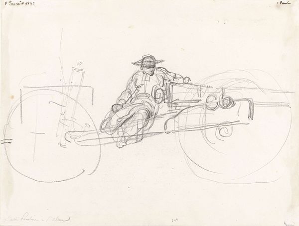 This pencil sketch of a motorcycle was made by John Singer Sargent around 1918 and feels like a quick study of form and light. The beauty of the drawing lies in its simplicity. The lines are delicate, almost tentative, as if Sargent is feeling his way around the subject, trying to capture its essence with a minimal number of strokes. Look at the front wheel; it's not a perfect circle, but rather a series of broken lines that suggest roundness and movement. The shadows are rendered with a similar economy, creating a sense of depth and volume. What I find interesting about this sketch is its unfinished quality. It's not a polished, idealized representation of a motorcycle, but rather a glimpse into the artist's process, a moment of exploration and discovery. It reminds me of some of Picasso's early sketches, where he was experimenting with form and perspective. This piece leaves room for our imagination to fill in the gaps.
