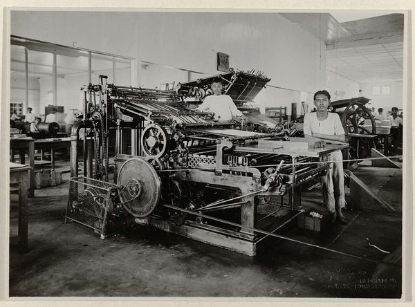 Editor: We're looking at "Grote linieermachine," a photograph from 1921. I understand it as "The Big Ruling Machine". I find the atmosphere intriguing. It's so…stark. All those young people working, and that looming machine. What do you make of it? Curator: It's more than stark; it whispers of relentless industry. The architecture is spartan, efficient, with large windows that try but seem to fail at softening the mechanical landscape. What catches my breath isn't just the ruling machine itself, its beautiful, terrible geometry, but how these young faces seem dwarfed, almost consumed by the repetitive task. Don't you feel it? Editor: Definitely. Almost like they're part of the machine themselves, each face just another cog. The uniformity of their attire amplifies that. Do you think that was intentional on the photographer’s part? Curator: It begs the question, doesn't it? I mean, is this photography bearing witness, making us feel the cold weight of progress…or does it unconsciously aestheticize it? Does the starkness unintentionally elevate this mechanical efficiency? The light, almost theatrical… Editor: I see what you mean. It’s thought-provoking how the image balances critique and romanticism, and how this makes you consider both. It is both repelling and somewhat pretty in the lighting. It changes how I look at "progress"! Curator: Precisely! This image acts as an invitation, almost, a starting point. Every time I engage, the machine seems more alien and the people more vulnerable. The longer I look, the less I actually understand. It reminds us of the crucial value of pausing.