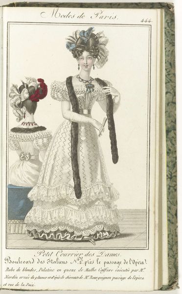 Curator: What a lovely image, "Petit Courrier des Dames," from 1827, currently housed at the Rijksmuseum. It’s an engraving depicting the height of Parisian fashion. Editor: My initial impression is one of delicate extravagance! The dress is so ornamented, and the hair—it’s a literal garden on her head. What does that signify to you? Curator: For me, the roses are very significant. They could symbolize beauty and love, of course, but given their strategic placement—on her head and near her heart—they might also hint at the importance of beauty and romance in a woman’s life at the time. Also the Greek key. It signals Neoclassical and Roman references to fashion, status, and ideals of female beauty that harken back to ancient aesthetics. Editor: Absolutely! And look at the text below! This isn't just any dress. The text indicates it’s tulle from the Magasins de la Reine Elisabeth, suggesting elite consumership but also highlighting labor through 'M. Croisat,' who adorned her hair. I'm drawn to the sheer materiality, from the paper to the inks and then to think about that elaborate tulle fabric itself, what its physical presence would convey about wealth and class. Curator: Precisely. It represents a confluence of artistry and the aspirations of the bourgeoisie. The elaborate hair, coiffed by M. Croisat, frames her face like a halo. It's as if they’re elevating her to an almost goddess-like status. The floral garland becomes a potent emblem of female virtue and desirability. Editor: That's insightful. I agree this image functions to idealize elite French womanhood as highly crafted in the physical dress but also in how her very image is created by so many hands. Curator: Studying prints and engravings such as these provides us not only with a moment frozen in time, it enables a profound glimpse into cultural aspirations. Editor: It is captivating to note how artistry intersects with consumerism and labor. The layers involved really do highlight a complex process of production, beauty, and commerce of this very crafted ideal.