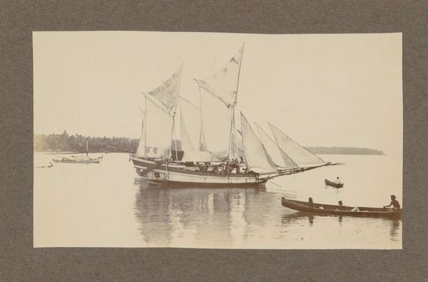 Editor: Here we have a gelatin silver print, taken sometime in the 1920s or 30s by Klaas Kleiterp: *Zeilschepen met gehesen zeilen voor de kust van Nederlands-Indië* – Sailing Ships with Sails Hoisted off the Coast of the Dutch East Indies. It’s quite a calm image; a fleet of ships seems to be waiting serenely just off the coast. What stands out to you? Curator: Ah, a peaceful slice of colonial-era maritime life, captured in that soft, almost dreamlike quality that gelatin silver prints often possess. What I see is not just a tranquil scene, but a visual whisper of power and trade. These aren't merely boats; they’re conduits, arteries of empire connecting the Netherlands to its resource-rich colony. The very act of photographing them – a European gaze upon this landscape – speaks volumes. What do you make of that "Orientalist" tag? Editor: That’s interesting… I hadn’t considered the colonial aspect so explicitly, but I see what you mean. And now the "Orientalism" tag feels heavier; I suppose it speaks to that outside gaze, exoticizing the scene for a Western audience? It's no longer just a landscape, but a representation. Curator: Precisely! The photographer, consciously or not, frames the scene through a lens tinged with Western expectations and desires. Think about the light – isn't there a touch of the painterly, almost theatrical lighting, as if staging an idea of the “exotic” East? What mood does it conjure for you, knowing this context? Editor: It shifts the whole piece, doesn't it? The tranquility feels… staged, almost. There's an underlying tension now, a sense of imbalance. The "landscape" genre suddenly feels inadequate. Curator: Exactly! It reveals how photographs can be so much more than simple documents. This image becomes a mirror, reflecting not just a place, but a relationship of power, desire, and the enduring legacy of colonialism. We went somewhere I wasn't anticipating! Editor: I totally agree, thinking about context adds so much depth and nuance that wasn't initially apparent. Thanks for enlightening me!