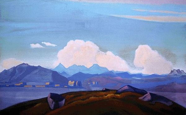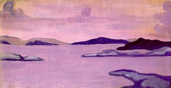 Editor: This is Nicholas Roerich's oil painting, "Treasure", created in 1919. I'm struck by how dreamlike it is; the subdued colors and flattened perspective create a sense of otherworldly calm. How do you approach an interpretation of this piece? Curator: From a formalist perspective, the immediate impact is derived from Roerich's calculated use of color and form. Notice the limited palette, dominated by variations of purple and brown. How does this restrain our emotional response? Editor: I see how the limited color palette and broad strokes simplifies the landscape, turning the mountains and clouds into abstract shapes. This definitely encourages a meditative feeling over realistic observation. Curator: Precisely. The flatness of the composition is also significant. There's minimal depth, causing all elements to exist on a single pictorial plane. What is the impact of this on the image as a whole? Editor: The lack of perspective intensifies the two-dimensionality. It’s almost like looking at a stage set rather than a vista, reinforcing that dreamlike feeling I mentioned before. Curator: Exactly. In other words, this dreamscape could be analyzed using principles of structuralism and even the use of signs, since, in the end, there isn’t a lot of emphasis placed on realism. Through such means, a landscape turns into pure aesthetic thought and semiotics. Editor: So by emphasizing color and form over realistic depiction, Roerich prioritizes the aesthetic experience itself. That gives a lot more weight to the pure feeling of the piece, regardless of what "treasure" might mean literally. Curator: Indeed. Considering "Treasure" in terms of line, shape and tone allows an engagement with its fundamental construction. Perhaps this provides a richer reading, by inviting the viewer to explore it not as a landscape, but an essay of pure color. Editor: That really shifts my understanding of the piece; I see it less as a scene and more as a construction now. Curator: And therein lies the strength of formalist engagement; stripping away external narratives and seeking what is, structurally.