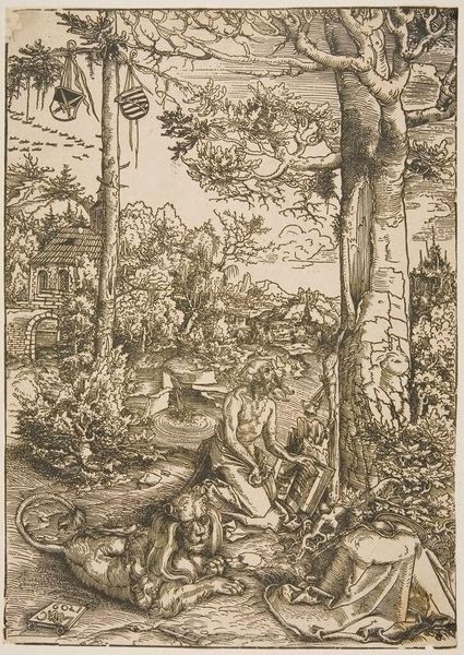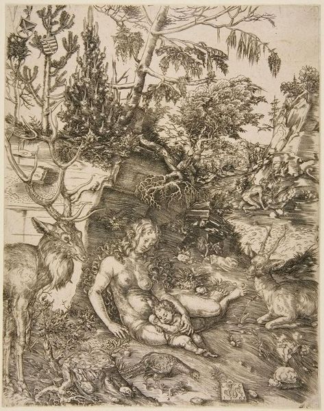 Curator: Lucas Cranach the Elder created this print, "Rest in Egypt," sometime in the 16th century, now held at the Harvard Art Museums. Editor: It's incredibly charming, isn't it? A dense tapestry of figures nestled into a woodcut, creating a scene that is both peaceful and teeming with life. Curator: Absolutely. The image depicts the Holy Family's flight to Egypt, escaping Herod's persecution. Cranach, however, imbues it with a distinctly German Renaissance sensibility, filling the scene with frolicking putti and a fairytale-like forest. Note also the serpent emblem, a symbol that signals the Saxon Electorate's protection. Editor: It's interesting to see how political and religious symbolism blend together. It makes you wonder about the intended audience and the social context in which it was made. Was this meant as a devotional piece, a political statement, or both? Curator: Precisely. Consider the cultural memory embedded in the cherubs. They serve as both sacred imagery and a playful reimagining of innocence. Editor: The juxtaposition of the serene central figures with the riot of activity around them makes it a dynamic representation of a pivotal moment. Curator: A testament to art’s power to bridge the sacred and the secular, the political and the personal. Editor: Yes, and to consider how that blend resonates differently through time.