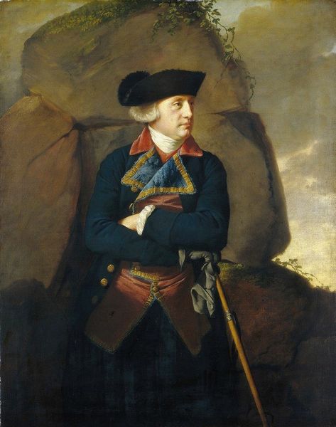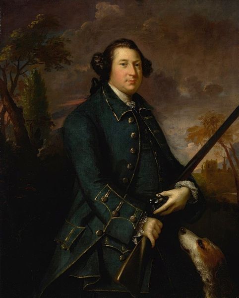 Editor: This oil painting portrays William Augustus, Duke of Cumberland, by David Morier. There is a stark contrast between his elegant attire and what appears to be a battlefield in the background, which makes me wonder about the narrative being told. What stands out to you? Curator: This portrait vibrates with a tension between power and its consequences. Cumberland, a figure of authority, is draped in finery—each piece a symbolic marker of status. The sash, the ornamentation—they speak of a celebrated leader, but I can't help but see more. Editor: More how? Curator: The battlefield behind him is not merely a backdrop. It's a cultural echo, isn’t it? The composition evokes the weight of command. Cumberland is known for his role in the Battle of Culloden… so, can a battlefield ever just be a field? The image immortalizes not just a Duke, but the indelible cultural impact of his actions, resonating long after. What kind of stories and sentiments would you imagine such symbols carried through the decades? Editor: So, even the colors carry a weight of historical narrative, right? Curator: Precisely! Think of how portraiture freezes a moment, amplifying and simplifying at once. Editor: I didn't realize how much a single image could hold! I see now the lasting relevance of his decisions, memorialized—or even weaponized—by symbolism and art. Curator: Indeed. And hopefully you will continue to delve deeper, peeling back the layers to truly uncover how an image transforms perception over time.