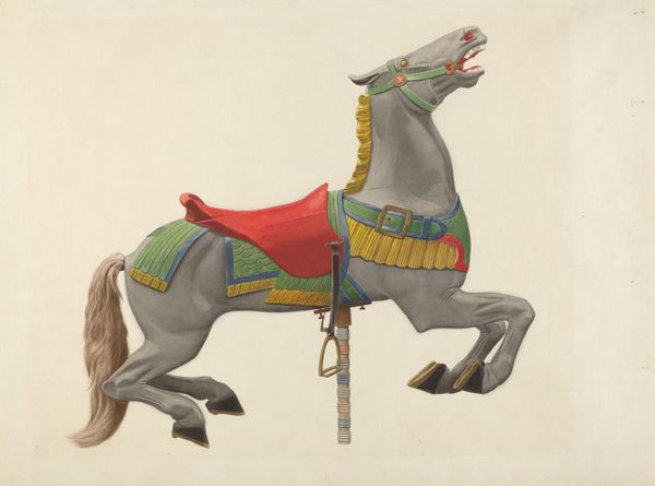 Curator: We're looking at "Toy Horse," created anonymously sometime between 1935 and 1942. It's a drawing that combines watercolor and graphite, depicting a wooden toy. Editor: It has an immediate quaintness, doesn't it? A certain simple elegance. I find the muted palette rather soothing, especially those gentle grey tones against the polka dots. Curator: Precisely! Let's delve into that design. Note how the anonymous artist rendered the toy horse's form. The structure itself is fascinating, this tension between a defined silhouette and a sort of simplified rendering of anatomical details. There's a subtle interplay of hard edges and rounded forms which provides both robustness and gentleness. Editor: Speaking of, one wonders what prompted its creation. During that period, the rise of mass-produced toys often overshadowed handmade crafts, folk art and toys that possessed unique cultural significance. What role did these artifacts have within their families and community? Is there possibly commentary on commercialism itself within the naive simplicity of it? Curator: The red dots disrupt an otherwise rather limited palette in interesting ways. These create texture through tonal contrasts. A pointillist strategy which invites the viewer's eye across the form. How are they arranged and spaced, and does that regularity affect our reading of this toy? The overall effect makes this toy horse into some symbol of warmth and comfort perhaps. Editor: Right, it is interesting considering its socio-economic context. This object becomes representative of something larger; family identity, possibly social critique in a quiet way. Curator: The formal composition combined with a historical reading enriches the work with symbolic qualities and depth. The lines invite movement even while fixed, and so on. A really intriguing study. Editor: It’s truly evocative. Seeing it through this lens encourages deeper considerations of art's many roles.