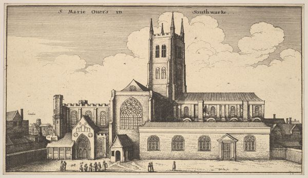 Curator: This is John Boydell's "Wrexham Church in County of Denbigh," a print that captures the north-east view of the church. Editor: It's striking how the stark monochrome emphasizes the building's gothic structure. The tower especially, with its intricate details, seems to dominate the landscape. Curator: Boydell's prints were vital in disseminating architectural imagery to a wider audience. This work reflects the growing interest in documenting local landmarks and making them accessible through print culture. Editor: True, and the composition guides the eye upward, inviting contemplation of the sublime. The contrast of the gothic architecture against the somewhat bare landscape creates an intriguing tension. Curator: The print hints at the social role of the church, the figures scattered around the grounds suggest a community hub. Editor: I see that now! And, the linear precision renders this place in a light that evokes grandeur and history. A powerful testament to architectural form. Curator: Indeed, a beautiful example of how art can reflect cultural values and historical significance. Editor: A compelling view, highlighting both the aesthetic and symbolic importance of architecture in the 18th century.