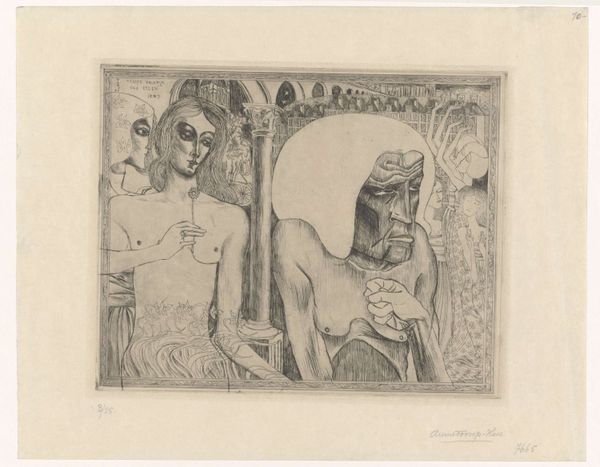 "De Sfinx" was printed by Bernard Essers, but the exact date is unknown. The hatching reminds me a little bit of wood engraving, an older process, and it’s all done in a monotone color palette of browns and blacks. It makes me think about how artmaking is this conversation across time and space. Look at the details in this print; the lines create a real sense of texture, especially on the skin of the sphinx. Is she made of stone or flesh? The way Essers layers those lines gives her such a palpable presence; I can almost feel the weight of her gaze. And notice the contrast between the solid, grounded figure of the sphinx and the delicate, almost ethereal, figures of the people below. Essers feels like a mix of Edvard Munch and Max Beckmann, maybe? It's a cool blend of angst and mystery, which speaks to the kind of ongoing experiment that art represents. We never really know what we're looking at, do we?