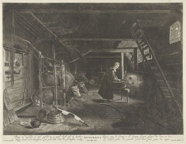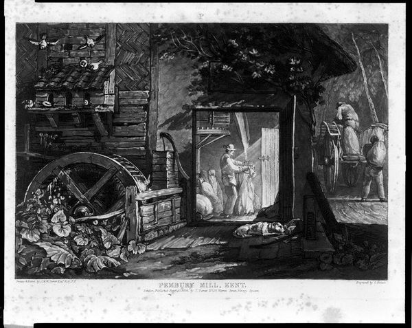 Curator: Giovanni Battista Piranesi's print, "Inside the Tavern," invites us into a haunting space with incredible depth. Editor: Yes, there’s something deeply unsettling about the sharp contrasts of light and shadow—an ominous quality, don’t you think? It makes me consider the narratives it obscures. Curator: Precisely. Piranesi, an innovator using the engraving technique, deploys lines to create an intricate system of forms. The composition centers around an interior defined by stark orthogonal lines. Note how Piranesi positions us as viewers, peering into a space that's both intimate and expansive. Editor: And what of this tavern space? It speaks to the common citizen of Pompeii. Here, we see figures, maybe negotiating something seedy in this half-ruined building. It all feels pregnant with unequal social relations. I am curious to understand how and why the Ancient is reclaimed here, and how we, as viewers, negotiate a fraught connection with antiquity. Curator: It's worth emphasizing the technical brilliance here. Piranesi uses linear perspective not merely to depict space, but to construct a rigorous visual experience—lines converge, diverge, suggesting depth and recession, all contained within the two-dimensional plane. He manipulates the concept of architectural grandeur within a more prosaic structure, doesn't he? Editor: Yes, and those deliberate formal choices also serve a purpose, to comment on the social context of its era. I would add that situating this artwork within a historical narrative allows for further understanding of 18th-century attitudes toward class and politics, given the backdrop of revolutionary foment in Europe. The romantic ruin becomes, then, not just aesthetic, but also a warning, maybe? Curator: I appreciate your take. I will be stuck, though, in this almost tangible construction of form, using these engraver's lines and how it generates that space. Editor: It's these multiple perspectives that allow us to view a historical image like this one with such complex emotionality. Thank you for your formalism.