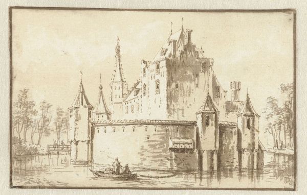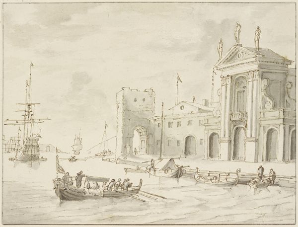 Editor: So, here we have Henri Adolphe Schaep's "Ontvangst van passagiers op een schip," likely made between 1841 and 1870. It appears to be an etching, maybe with some ink or pen work. It’s got a lovely, almost folksy feel to it. What catches your eye? What can you tell us about it? Curator: What I see is a visual document reflecting a very specific moment in social history. Etchings like these weren't just landscapes; they were often records of burgeoning trade, travel, and social mobility. Notice the figures disembarking. Consider who they might be – are they merchants, migrants, or members of the growing middle class? The act of ‘receiving’ passengers itself speaks to the infrastructures being built to accommodate increasing movement and exchange. Editor: That's a really interesting point about social mobility. It made me consider: Were the ports themselves impacted? Curator: Precisely. How does this image reinforce or challenge existing power dynamics? Who is granted access to these spaces, and who is excluded? Also, think about the ships – they're not just modes of transport, but powerful symbols of colonialism and global trade networks. We should ask ourselves about the ethical implications tied to what looks like a pleasant harbor scene. Does the picture celebrate an achievement at the expense of not showing the harsh circumstances of others? Editor: That's something I hadn't considered, the power dynamics inherent in something seemingly so simple. Curator: These seemingly straightforward images can offer valuable insights into complex social and political issues. Thinking about these helps give dimension to what at first looks quaint and lovely. Editor: I appreciate you broadening my perspective!