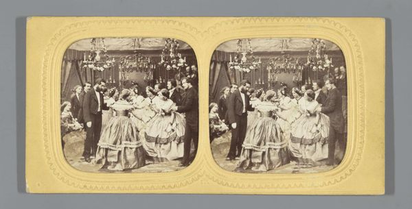 Editor: This is "Dancing Couples in a Room with Arches and Chandeliers," a photograph, likely an albumen print, by F. Chevalier and A. Champeaux from around the mid-19th century. There's an undeniable sense of opulence in the image; I can almost hear the music! What historical narratives do you see present here? Curator: This image provides us a glimpse into 19th-century European social structures. Consider the restrictive gender roles—the women in their elaborate gowns, seemingly objects of display in contrast to the men in darker attire, positioned as active participants. Does this visual arrangement, intentionally or not, reflect the power dynamics of that time? Editor: Absolutely, I see the contrast now. The women’s attire almost merges them into a collective, while the men have a stark individuality. Do you think that this work can be considered documentary photography? Curator: In a way, yes. However, we must acknowledge that even early photography was curated. What is shown and, more importantly, what is omitted, speaks volumes. Who had access to these grand spaces and celebratory events? Who was excluded? Photography, in its inception, carried with it the same class biases as painting did. Editor: So, the photograph captures a certain reality, but one that’s deliberately framed. Are there any particular artists, artworks or even theorists that spring to mind? Curator: Think of Griselda Pollock's theories on space and representation, and how social structures define these roles. Or consider how Foucault's ideas on power are visually articulated in this photograph. It invites a deconstruction of not just what we see, but what is systematically absent. Editor: That is a great point. Thinking about this piece through a critical lens gives it a completely different meaning. It goes beyond being just a pretty scene. Curator: Precisely. And that, to me, is the continuing relevance of art history; using the past to illuminate the present.