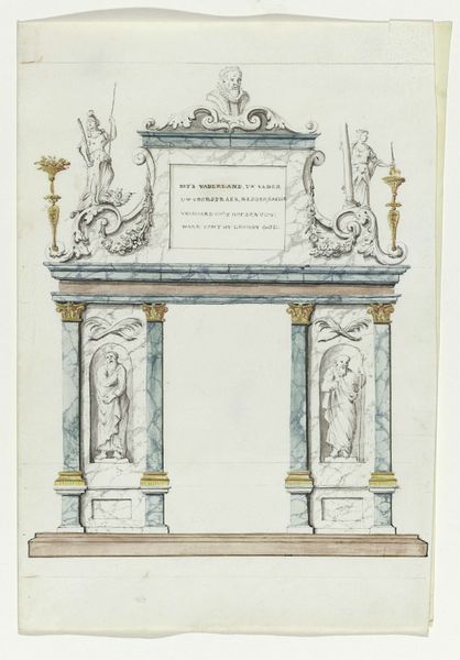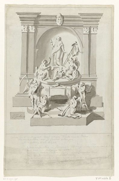 Curator: Let’s turn our attention to this print, "Grafmonument van de contessa de Haro," dating from 1772 to 1837 and attributed to Pietro Fontana. It's currently held in the Rijksmuseum collection. Editor: Oh, wow. Immediately, it hits you, doesn't it? Such stillness and sadness frozen in gray scale. It reminds me of walking through an old graveyard, the stones worn smooth with sorrow. Curator: Indeed. Formally, this work utilizes engraving techniques to achieve a trompe-l'oeil effect, mimicking the appearance of a bas-relief sculpture. It’s a history-painting with strong neoclassical elements, very much in vogue during that period. We see idealized figures draped in classical garb. Editor: "Mater Infelicissima," I think that's the inscription… "Most Unhappy Mother," with that figure clinging to the, I presume, deceased contessa, and others weeping around the bier—it is heart-wrenching, really. Curator: Precisely. The artist meticulously employs linear perspective to construct depth within the relief. Note the play of light and shadow, intended to replicate a three-dimensional sculpted scene, even though we're dealing with a two-dimensional medium. The garlands decorating the monument also point toward an interest in naturalism blended with formal constraints. Editor: What gets me is how distant the actual person, the contessa, feels. It is so formal, idealized even, that you don't mourn a real person, just a symbolic representation of grief and loss. Curator: That speaks to the broader cultural context. Neoclassical art was not solely concerned with verisimilitude but with conveying moral and historical narratives through a universal visual language, echoing Greco-Roman aesthetics. It aimed to ennoble and instruct. Editor: I get it, but I also long for something more raw, something more messy and personal, you know? But within its formal constraints, you can feel some emotions pouring out through the characters. Curator: A fascinating dichotomy, the personal expressed through the impersonal. Thank you for spotlighting those emotional intricacies, which at first can be concealed in an artwork seemingly defined by convention. Editor: My pleasure. Maybe true grief and loss always find a way to peek through the artifice. It’s what makes us human, even in stone.